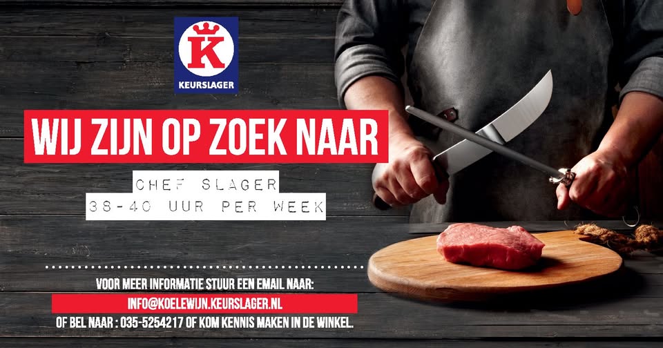 Ben jij volleerd slager, maar toe aan een nieuwe uitdaging?✨️ WIJ ZOEKEN JOU!👉💪 Wij zijn opzoek naar een Chef Slager.🥩 Wat bieden: -Fulltime dienstverband -38 tot 40 uur per week in 4 dagen -20% korting op boodschappen in de winkel👜 -werken in een gezellig team😁 -ruimte krijgen om jou creativiteit tot uiting te laten komen. Wat wij zoeken: -Minimaal in bezit van het SVO diploma Winkelslager -Werkervaring in de slagerij -Klantvriendelijk -Servicegericht -Flexibel -Enthousiast -Teamspeler Herken jij jezelf hierin? Kom eens kennis maken in de winkel of bel ons of stuur een mailtje voor meer informatie!😉 Keurslager Koelewijn vershof huizen Kerkstraat 20 1271 RL Huizen 📞035-5254217 💻info@koelewijn.keurslager.nl