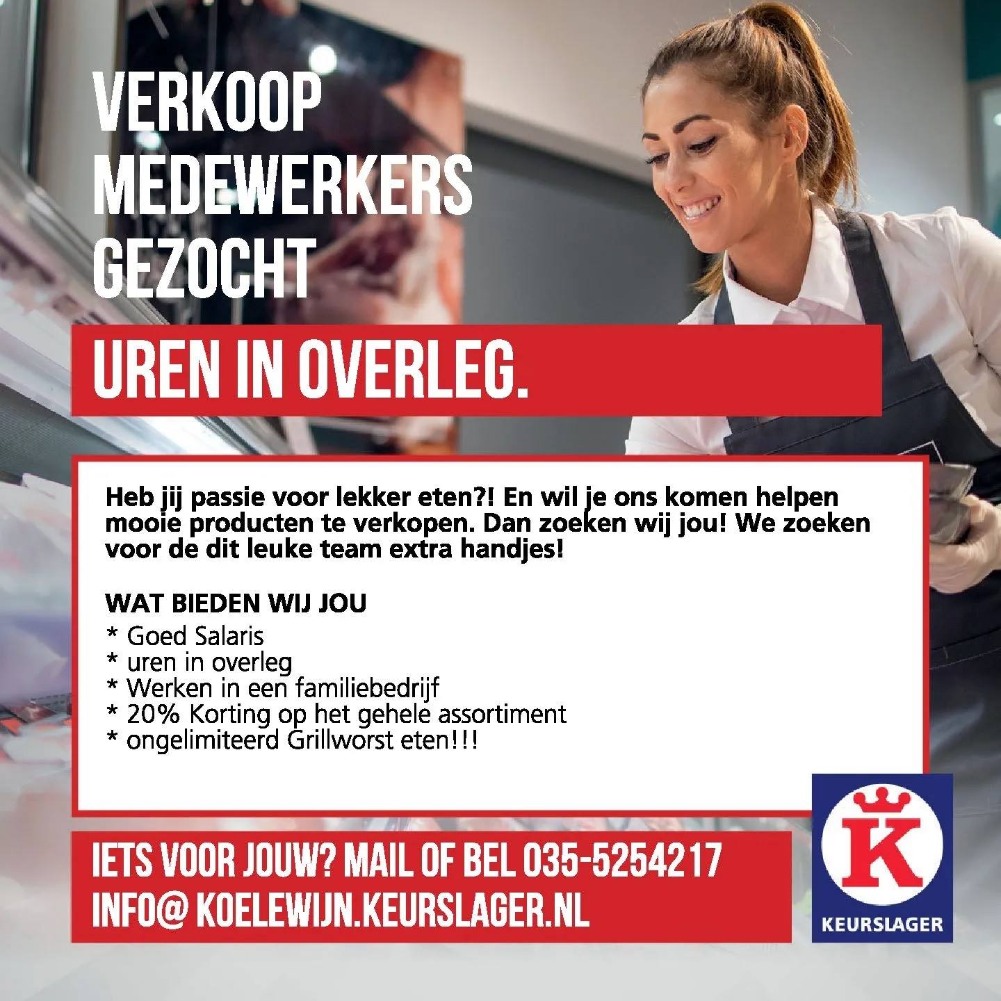 Heb jij passie voor lekker eten? en wil je ons komen helpen mooie producten te verkopen? Dan zoeken wij jou! We zoeken hard extra handjes voor dit leuke team! Wij zitten gevestigd in een Vershof, samen met een groenten winkel, kaas winkel en Bakker. Wat het werken extra gezellig maakt, omdat je met iedereen gedurende dag gezellig een praatje maakt. Wat wij Bieden: -Goed Salaris -Parttime of fulltime, om en om op zaterdag. -je werkt bij ons 38 uur in 4 dagen -20% korting op het gehele assortiment van de winkel -ongelimiteerd grillworst eten -ruimte om jou creativiteit te uiten Wat wij zoeken: -Iemand met passie om mooie producten te verkopen -Klantvriendelijkheid -Servicegericht -Enthousiast en een teamspeler -Nederlandse taal goed kunnen beheersen -Flexibiliteit Ben jij of ken jij deze topper? Kom dan snel bij ons solliciteren. Wij maken graag kennis met jou! Keurslager Koelewijn Verhof Huizen 1271 RL Huizen info@koelewijn.keurslager.nl 035 525 42 17