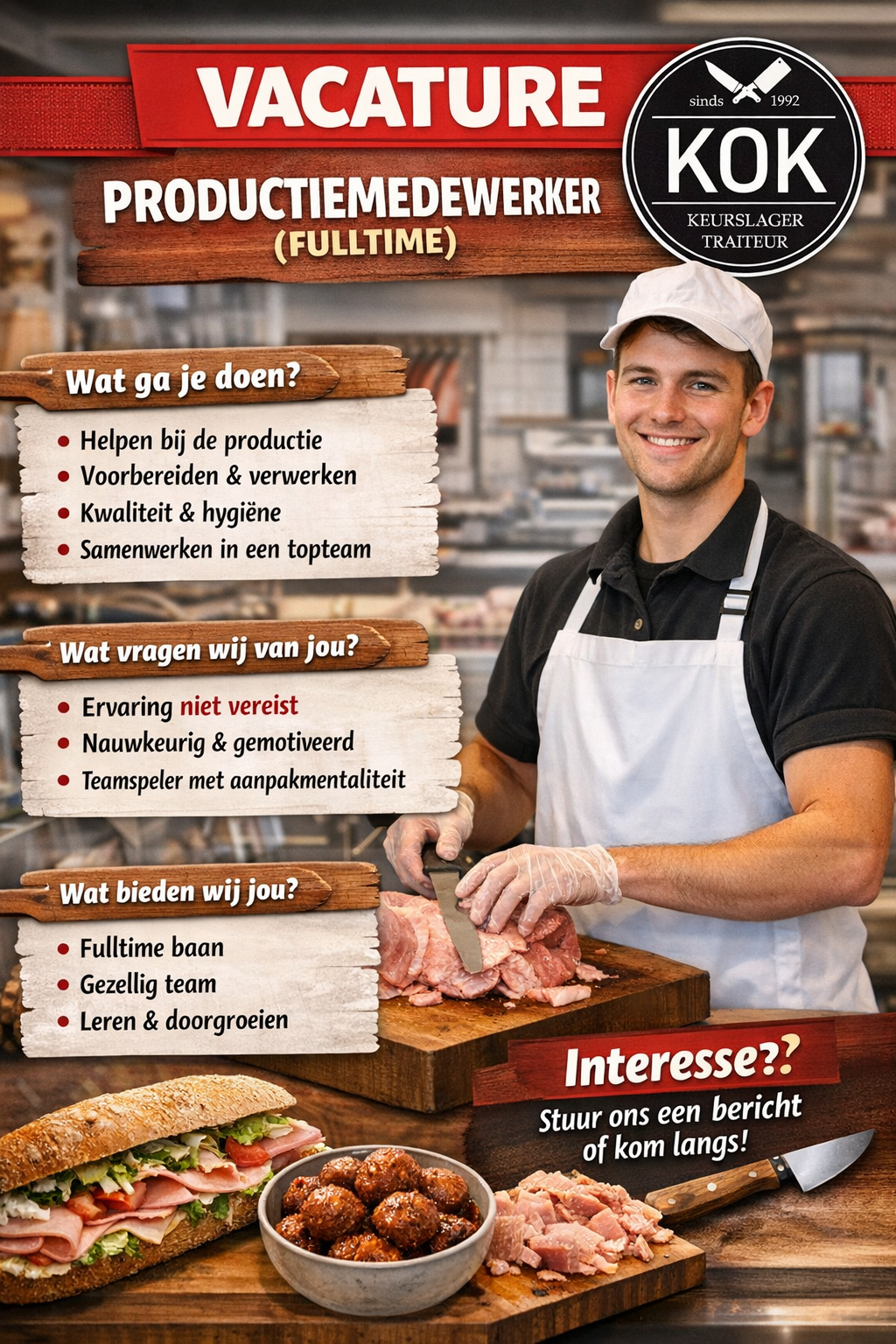 🔪 VACATURE: Productiemedewerker (Fulltime) 🔪 Ben jij een aanpakker en werk je graag met verse producten? Dan zijn wij op zoek naar jou! Voor onze ambachtelijke zaak zijn wij op zoek naar een fulltime productiemedewerker die ons team komt versterken. (vanaf 18 jaar) Wat ga je doen? Helpen bij de dagelijkse productie Voorbereiden en verwerken van producten Werken volgens vaste kwaliteits- en hygiëneregels Samen zorgen voor een strak en soepel productieproces Wat vragen wij van jou? Ervaring is niet vereist – wij leren je alles Je bent gemotiveerd en werkt nauwkeurig Je kunt goed samenwerken Je hebt een hands-on mentaliteit Wat bieden wij jou? Een fulltime baan Werken in een gezellig en professioneel team Afwisselend werk Goede begeleiding en ruimte om te leren (evt werken en leren) 📩 Interesse? Stuur ons een bericht of loop gerust even binnen. Wij maken graag kennis met je! Mail: info@kok.keurslager.nl Whatsapp: 0652698980 (Manon)